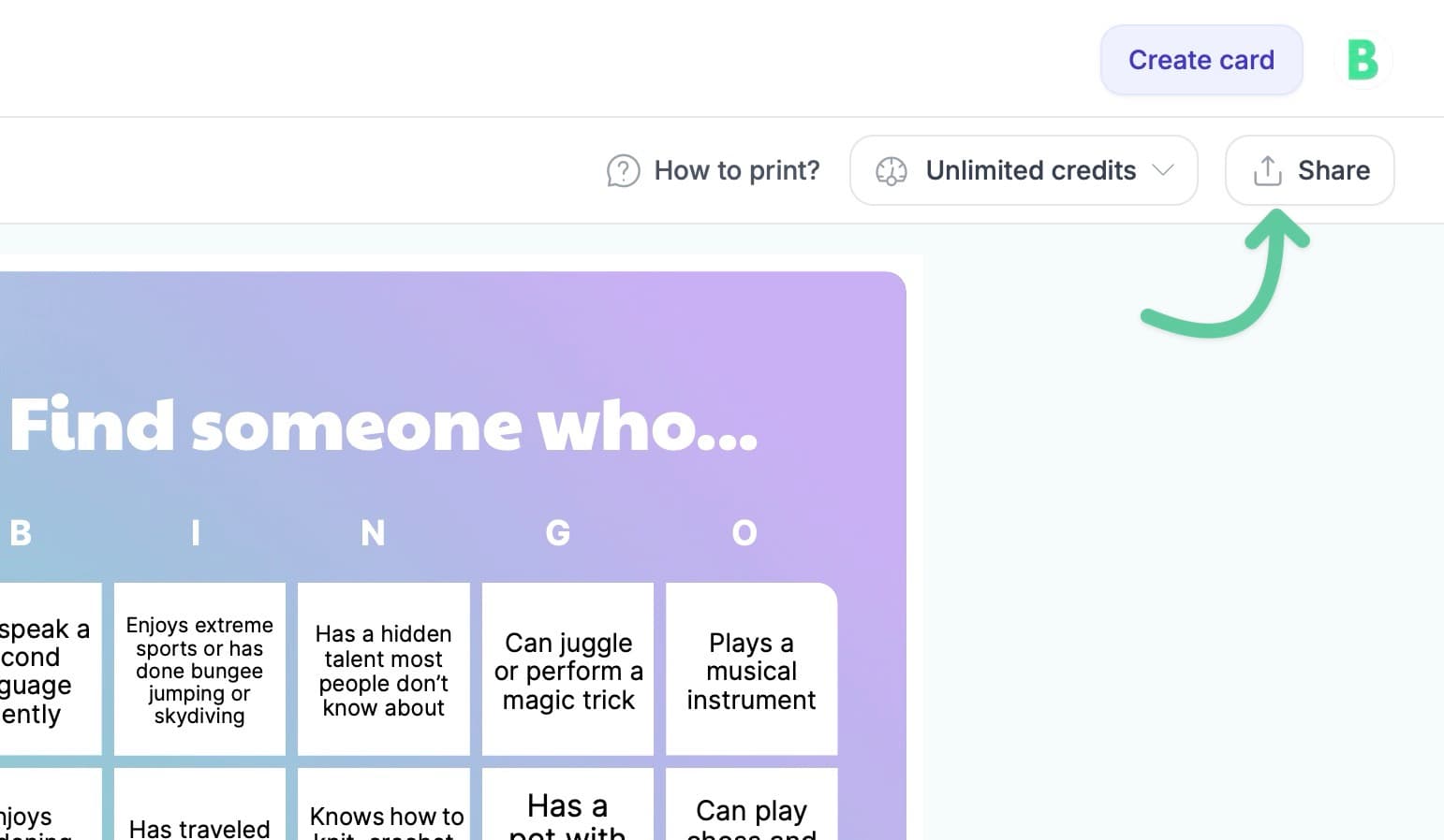- Share as a Template: Share your bingo card design as a template! Simply provide a link, and anyone who visits can quickly create a copy, edit it, print, or play online in their own account—perfect for sharing ideas and customizing games.