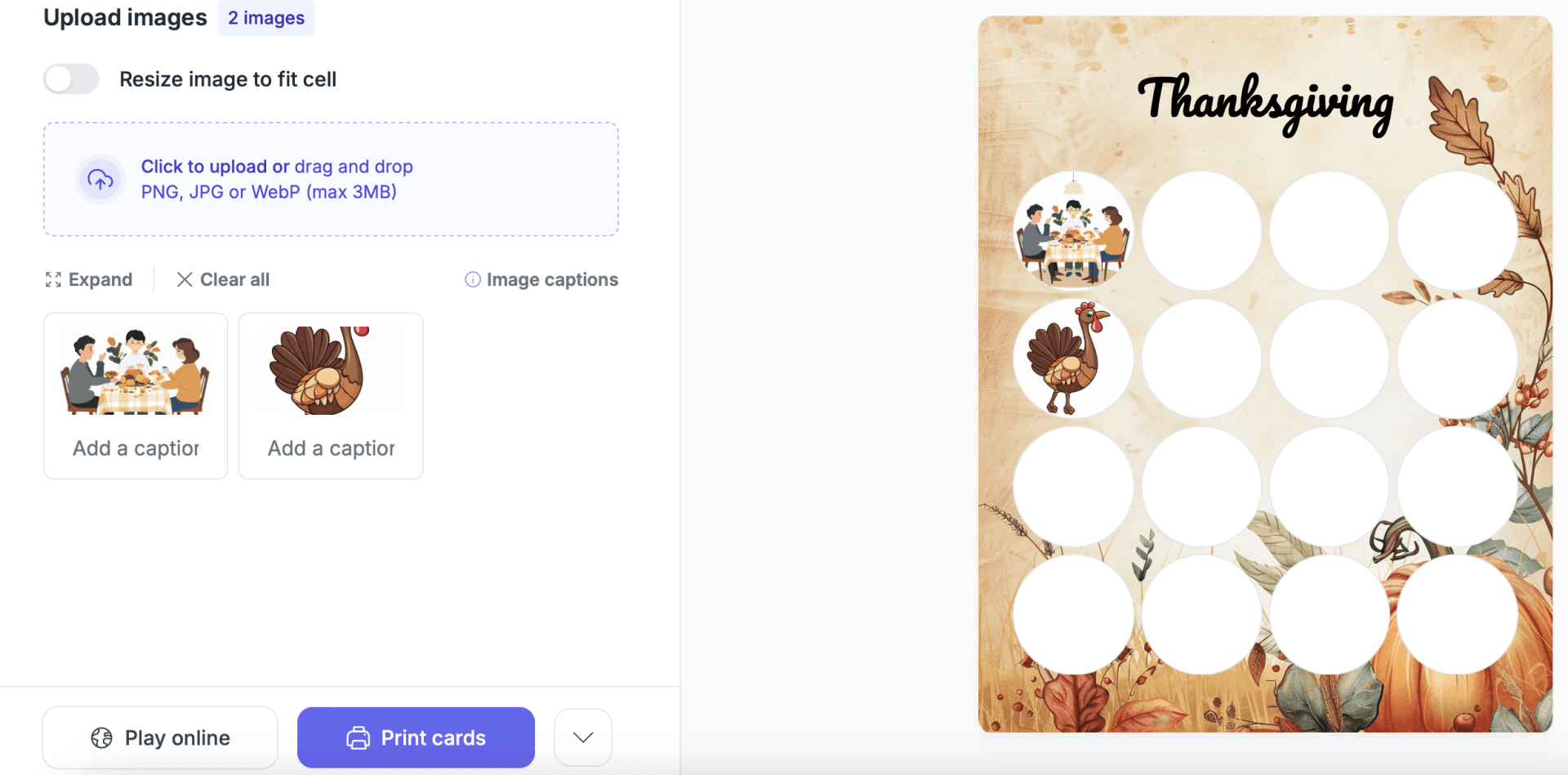 Create custom Thanksgiving bingo cards with holiday icons, family traditions, and festive twists to bring extra fun to your celebration!