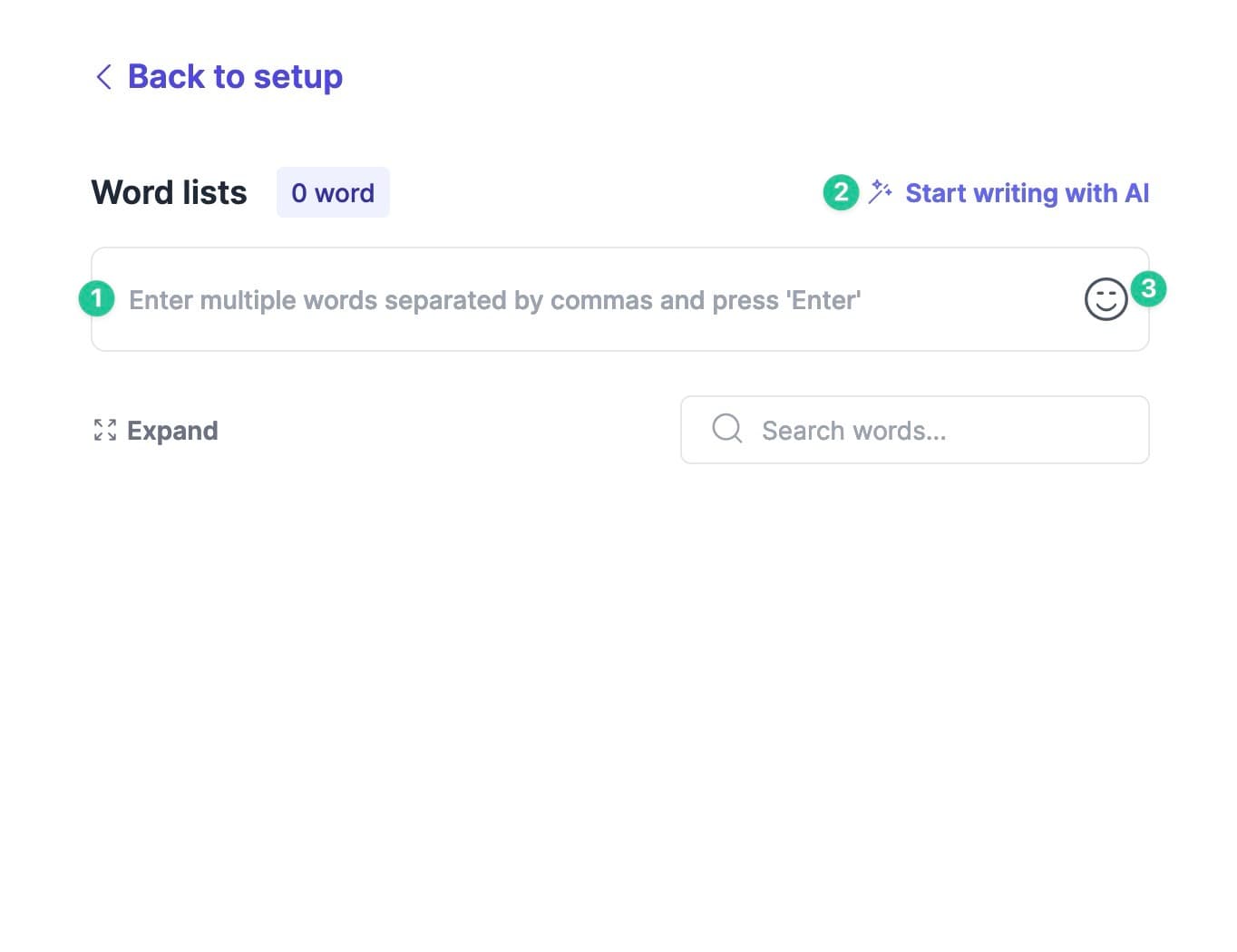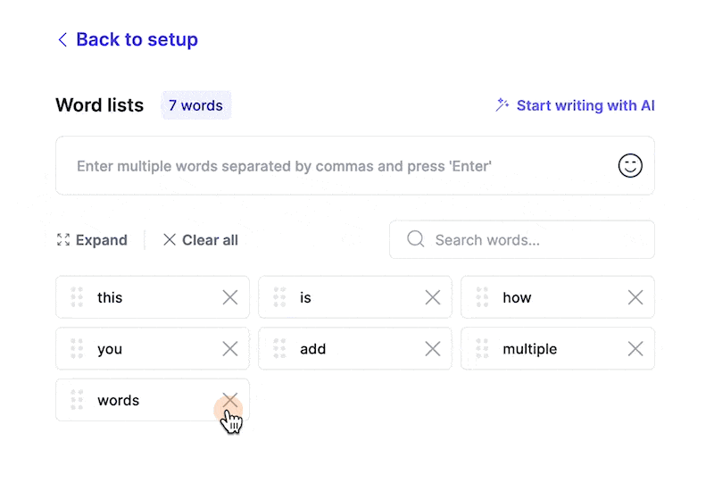- Enter your desired words in the text box, separating each with a comma or new line and pressing enter to add the words to the card.